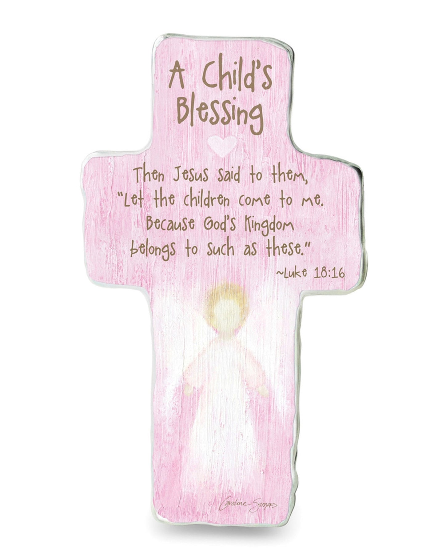 This 6-inch hand-cast metal cross features a polished edge and textured back with a metal easel hook for wall display. It displays the verse Luke 18:16, highlighting Jesus’ invitation to children. The piece includes licensed artwork by Caroline Simas and comes boxed for gifting or display.
