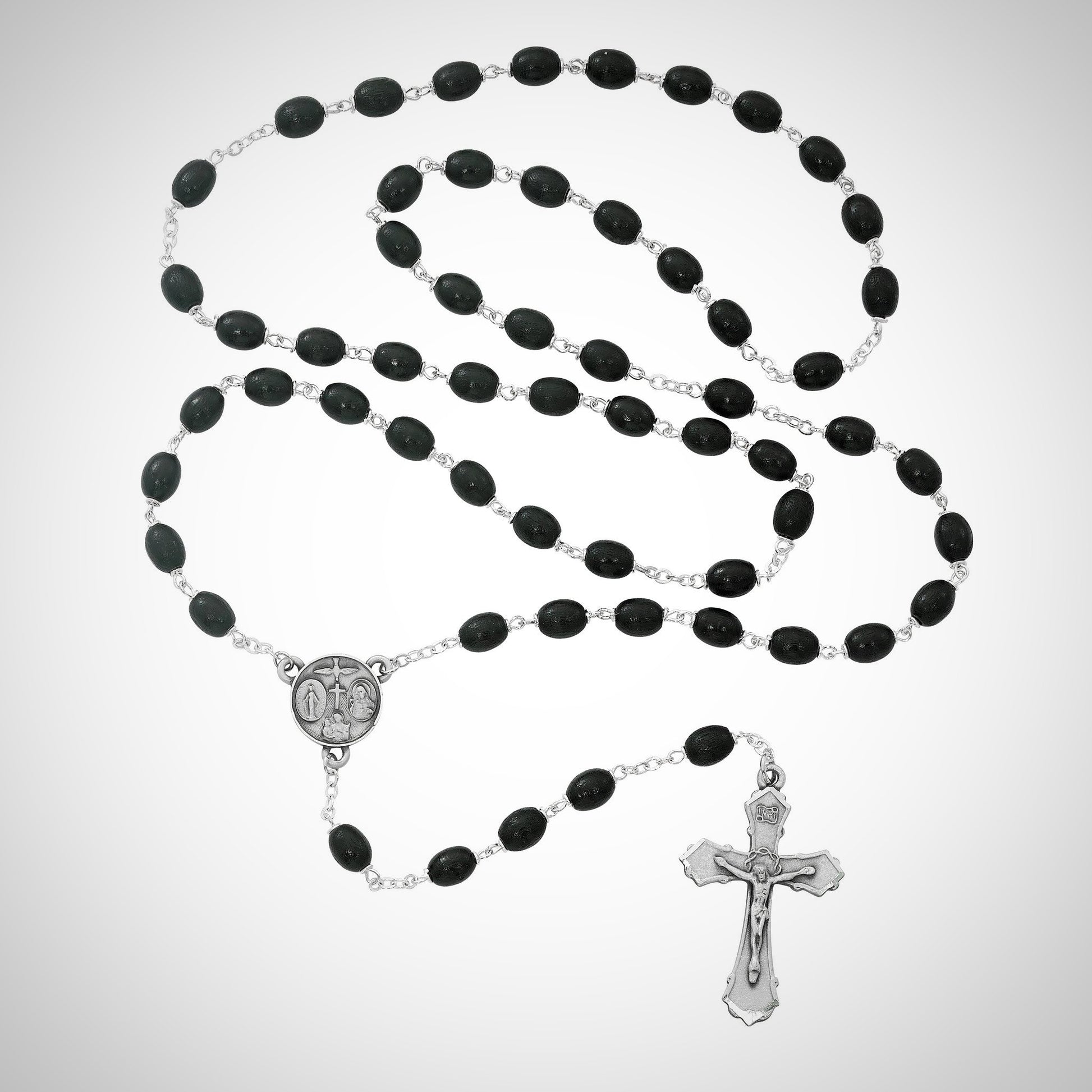 6 x 8mm black wood beads with pewter crucifix and center. Deluxe gift boxed.