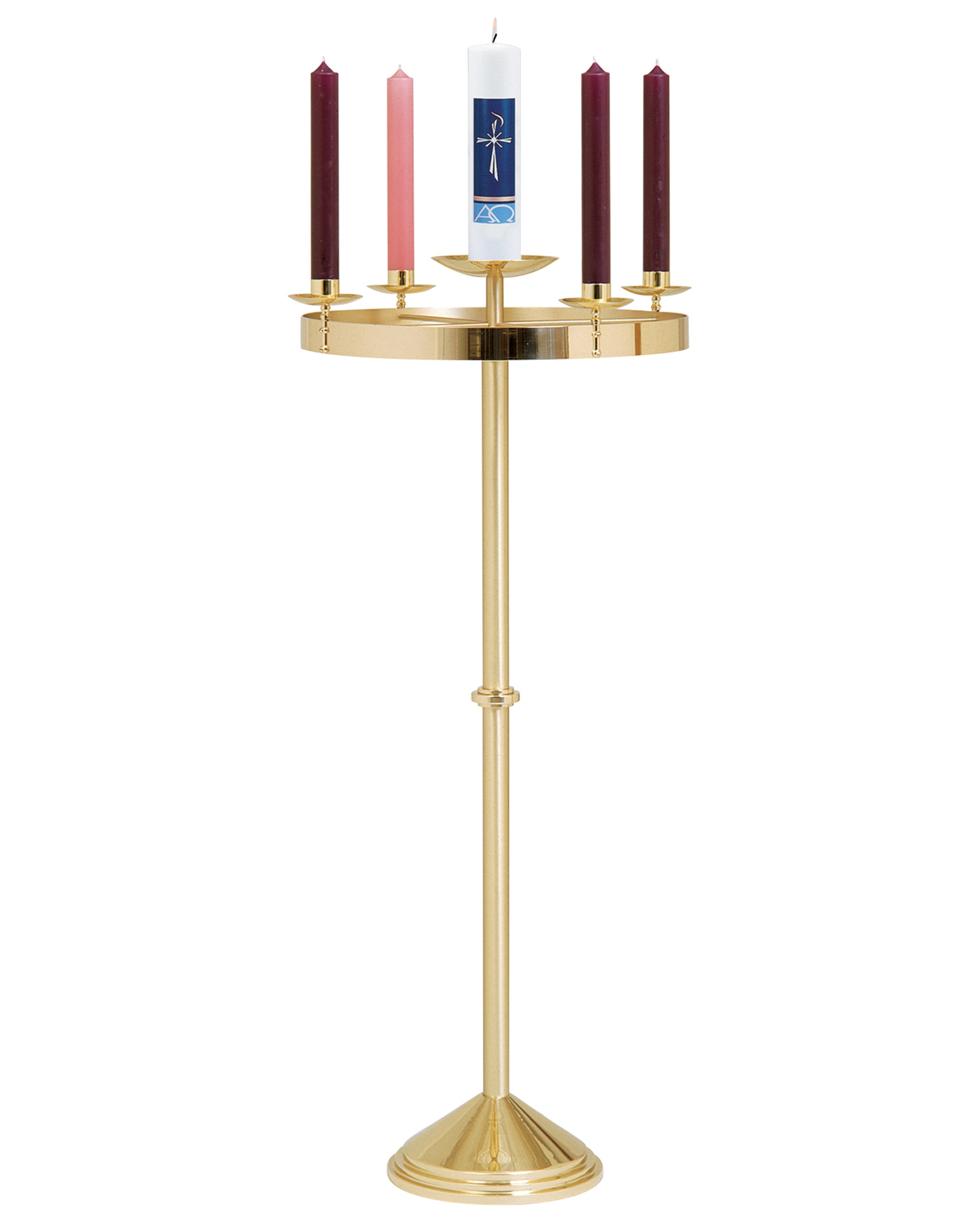 This Advent wreath features a sturdy, fixed two-tone finish with centre spikes that accommodate candles of any size. It measures 12" across the base and has a 21" diameter ring, standing 48" tall to the top of the ring. It includes one and a half sockets. Candles are sold separately.