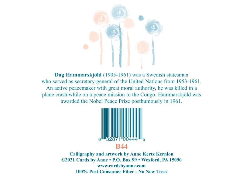 This birthday card features an inspiring quote from Dag Hammarskjold: "For all that has been, thank you. For all that is to come, yes." Inside, it extends warm wishes for a year filled with blessings. Measuring 4.25" x 5.5", the card comes with a matching envelope and is printed in the USA on 100% recycled paper, combining thoughtful design with eco-friendly materials.