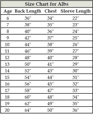 This double-panel alb is an ideal choice for altar servers. It features a double front panel and secures with Velcro® closures at the shoulders. Included are red and white cord cinctures. Please specify your size when ordering; refer to the size chart for guidance. Made from 100% polyester.