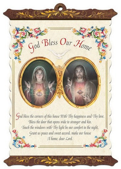 Measuring 8 by 10 inches, this plaque features a message printed on paper and mounted on medium density fiberboard (MDF). The scroll reads: "God Bless Our Home. Bless the corners with happiness and love. Bless the welcoming door, open to both stranger and kin. Illuminate the windows with Your light to comfort us through the night. Grant us peace and harmony, transforming our house into a true home, dear Lord."