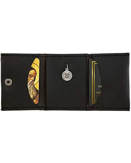 This black vinyl wallet measures 2 x 3 inches and holds Saint Benedict devotion materials, a holy card, and sacred medal. Gold lettering adorns the front, while the snap closure secures contents for convenient daily spiritual practice in your pocket or bag.