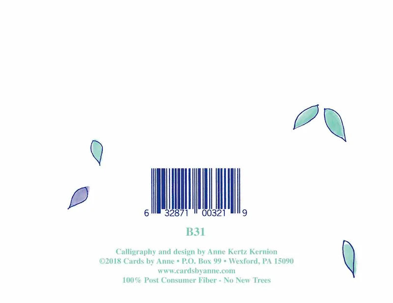 For over 35 years, Cards by Anne has specialized in hand-calligraphied cards that uplift the spirit. Her unique designs pair simple elegance with profound wisdom to speak to the heart.