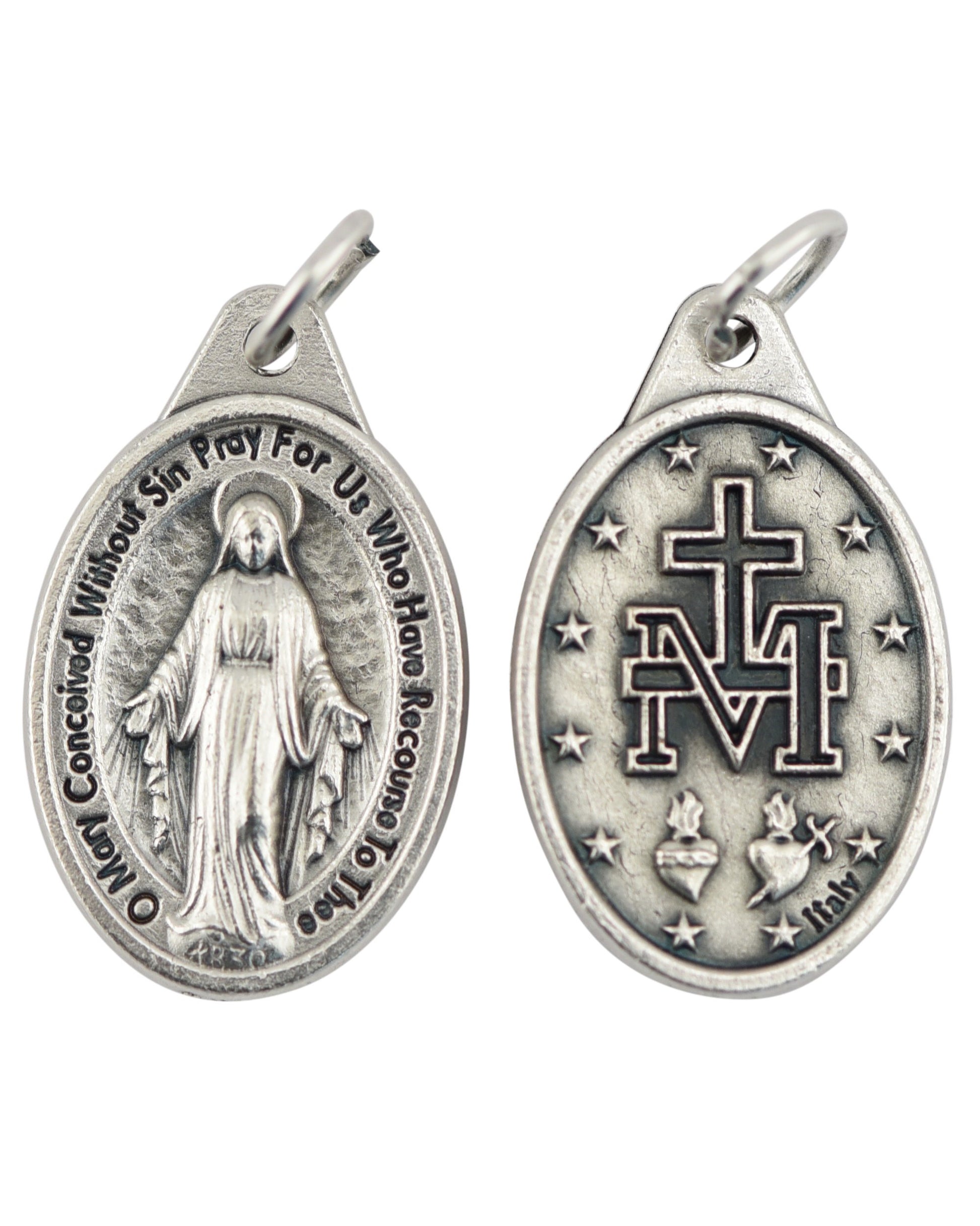 The Miraculous Medal is believed to bestow special graces upon those who wear it and seek Mary’s intercession through prayer. This oxidized silver oval medal, measuring 16mm by 22mm, is ideal for use in parishes, prayer groups, schools, ministries, or faith formation classes. Chain not included. Made in Italy.