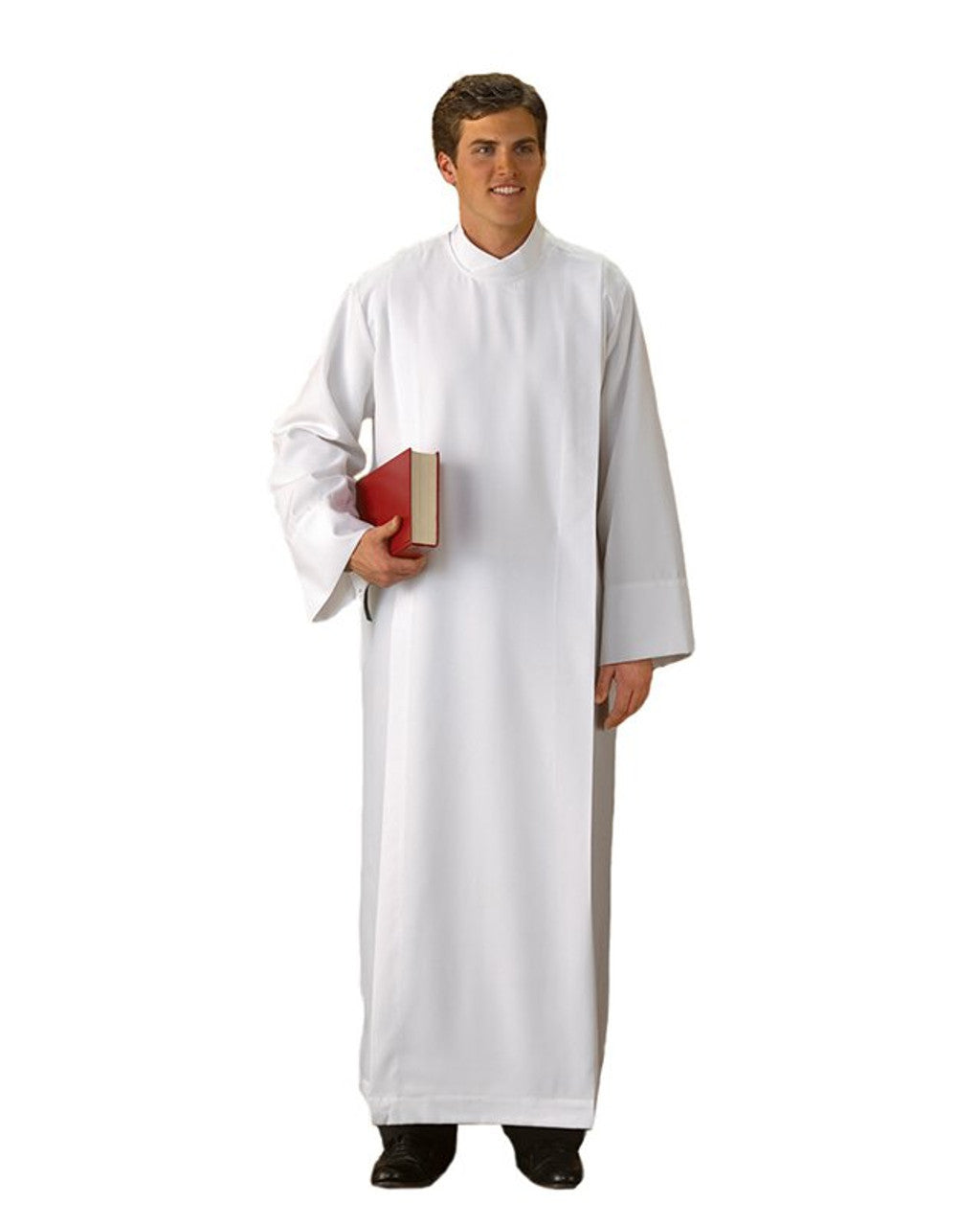 This front wrap alb is crafted with precise attention to detail, ensuring an excellent fit and practical use. Its collar is expertly tailored to sit neatly beneath chasubles. The garment lies smoothly for a polished appearance, featuring reinforced seams for durability and a Velcro® shoulder closure for ease. Side pockets provide added convenience. Please specify your size using the provided size chart when ordering. Made from 100% polyester, this alb is machine washable for easy care.