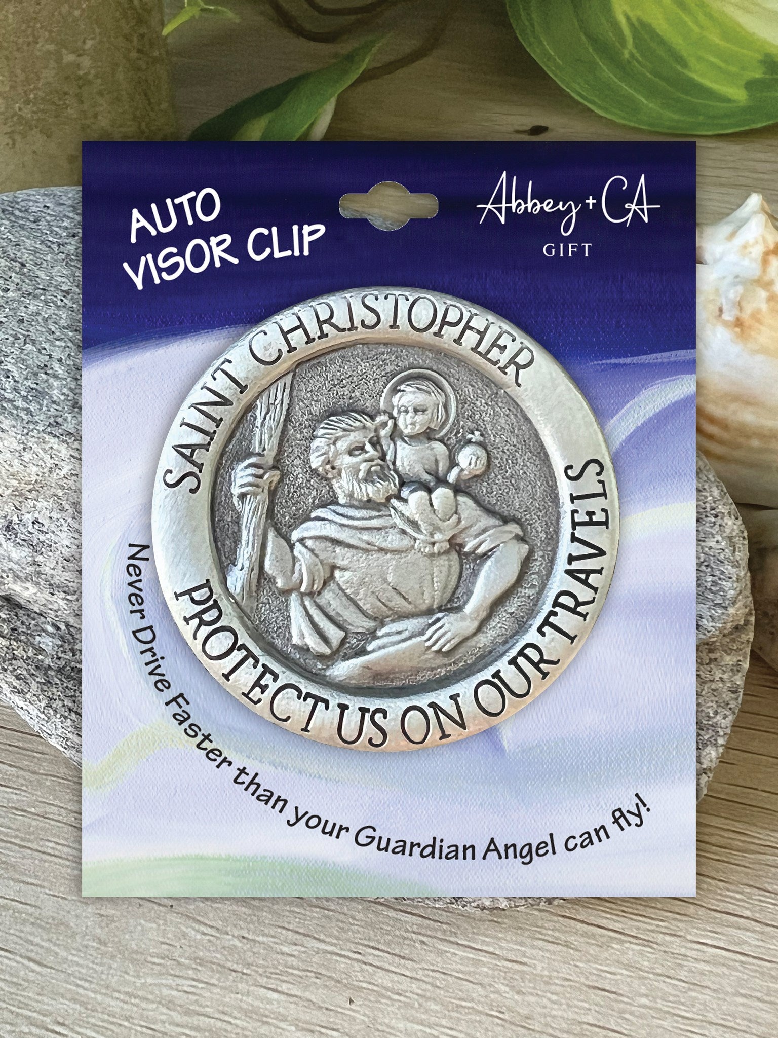 Round St. Christopher auto visor clip in silver enamel finish. Prayer: "Saint Christopher Protect Us On Our Travels". Carded. Metal clip on back that fits most visors.