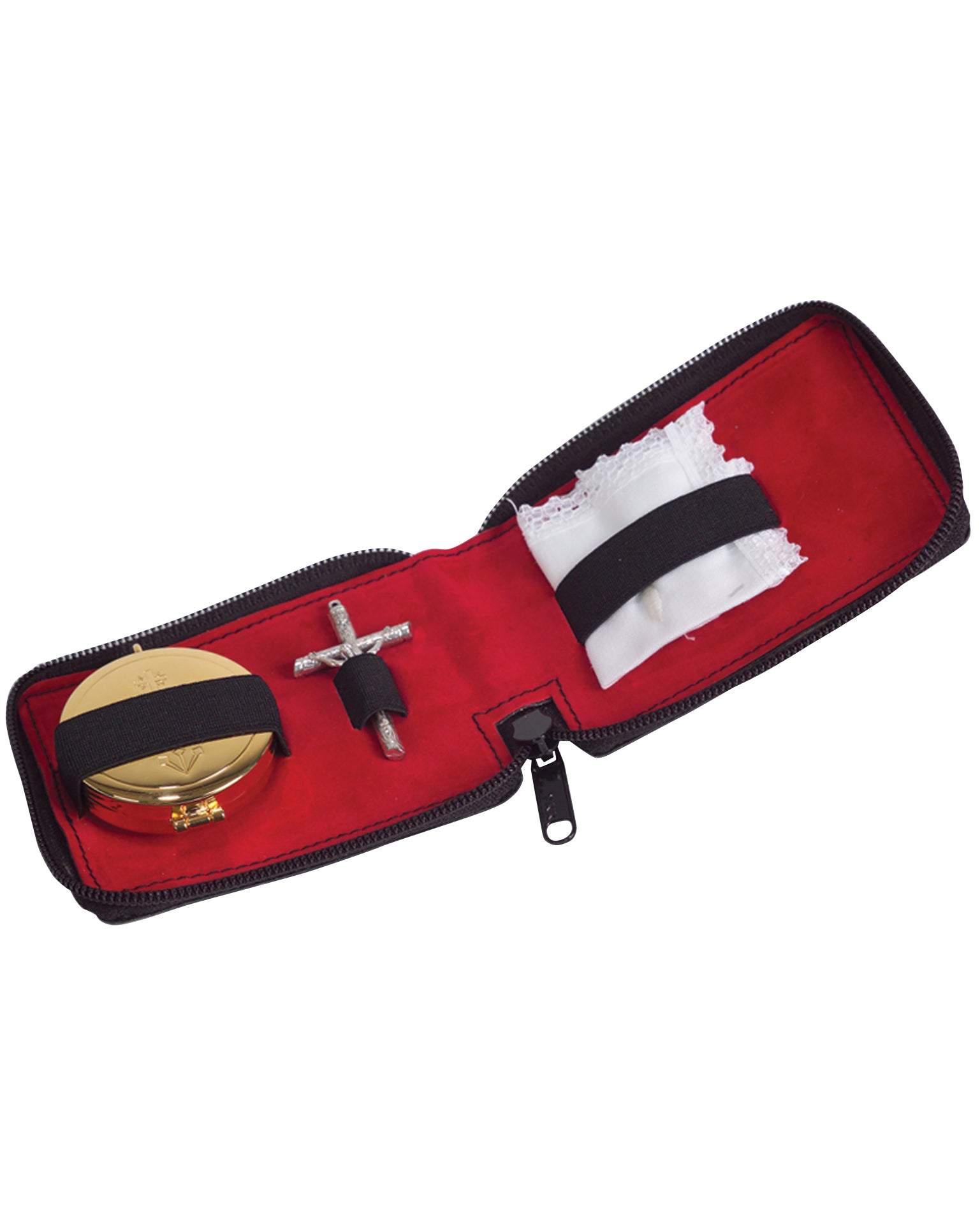 This Sick Call Set is designed for professional use, featuring a durable leather zipper case measuring 3.5" by 4.5" that ensures secure and convenient storage. It includes a 24K gold pyx with a 2" diameter, capable of holding up to seven hosts based on a standard 1 1/8" host size. The set also contains a 2 1/8" crucifix and a purificator, providing all essential items needed for administering sacraments with reverence and precision. This comprehensive kit combines quality materials and thoughtful design to support clergy in their pastoral duties.